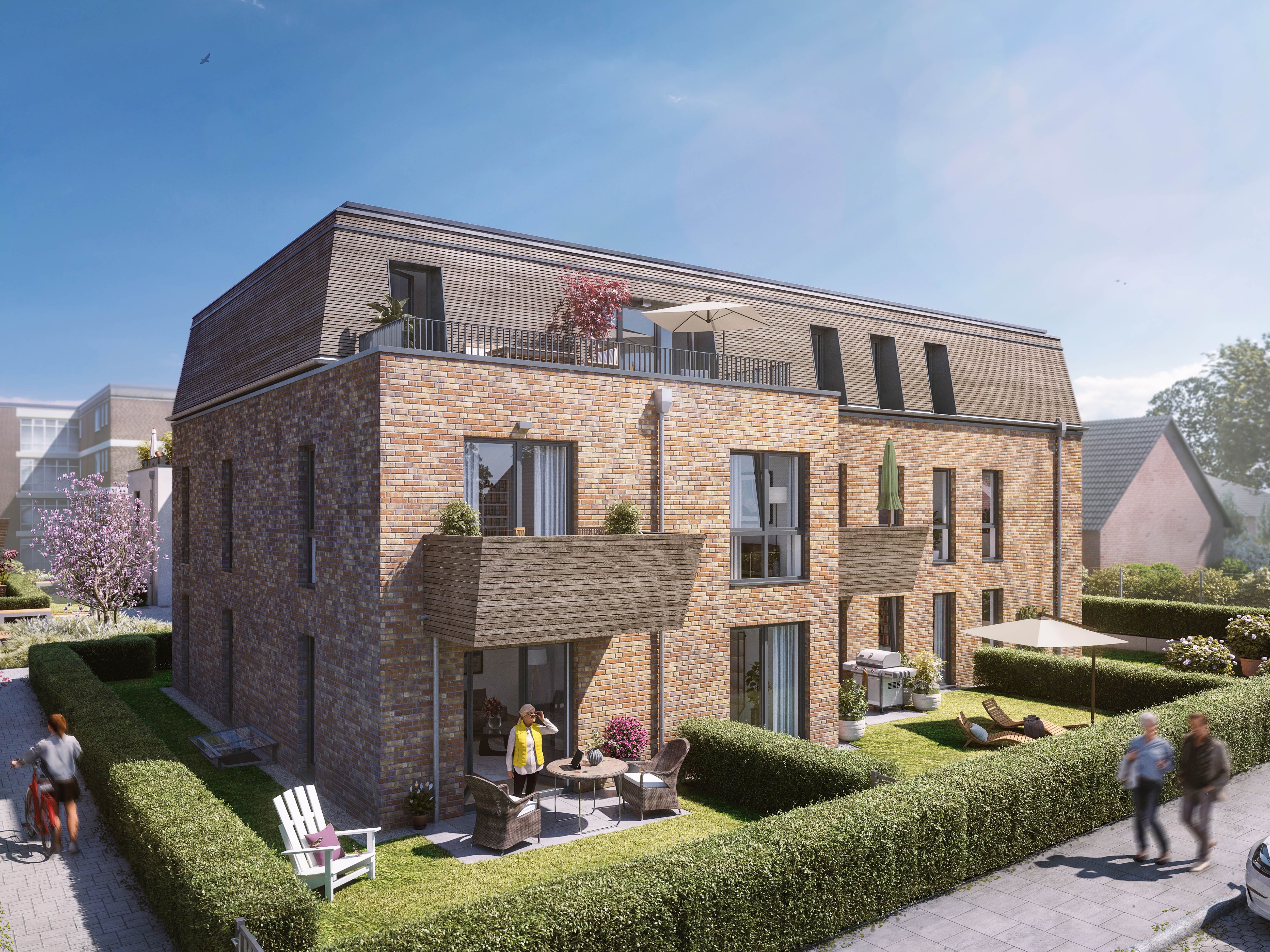 Auf dem ehemaligen Polizeigelände in Hittfeld entstehen 36 Wohneinheiten in fünf barrierefreien Mehrfamilienhäusern, die eine vielfältige Gemeinschaft fördern und Generationen verbinden.