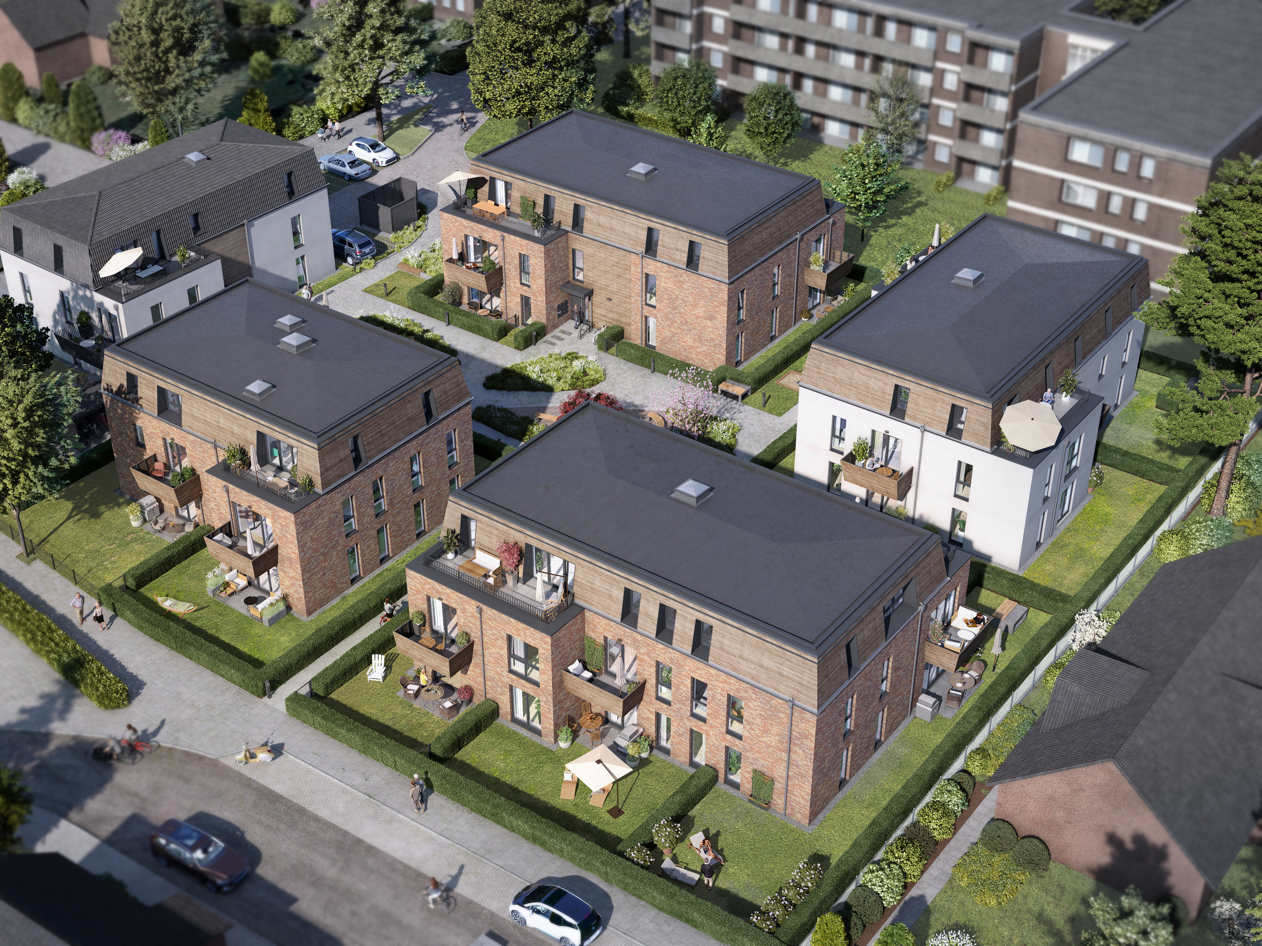 Vier Gebäude mit 30 Eigentumswohnungen und einer Tiefgarage sowie ein Gebäude mit sechs Mietwohnungen und oberirdischen Stellplätzen